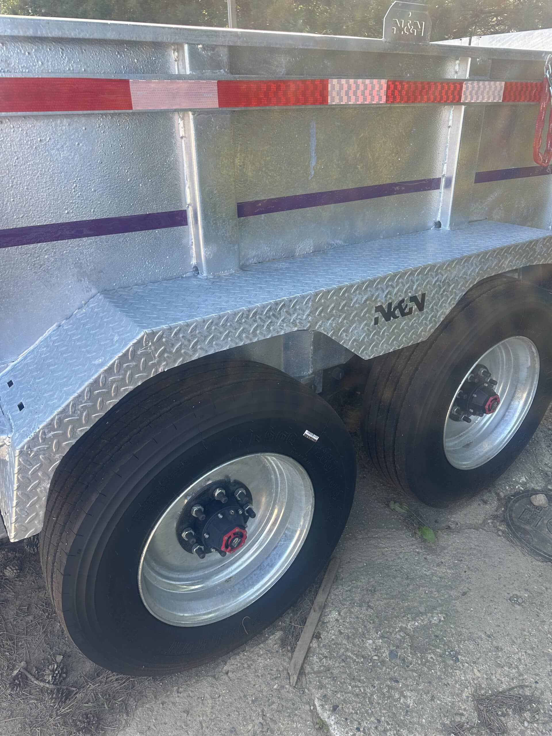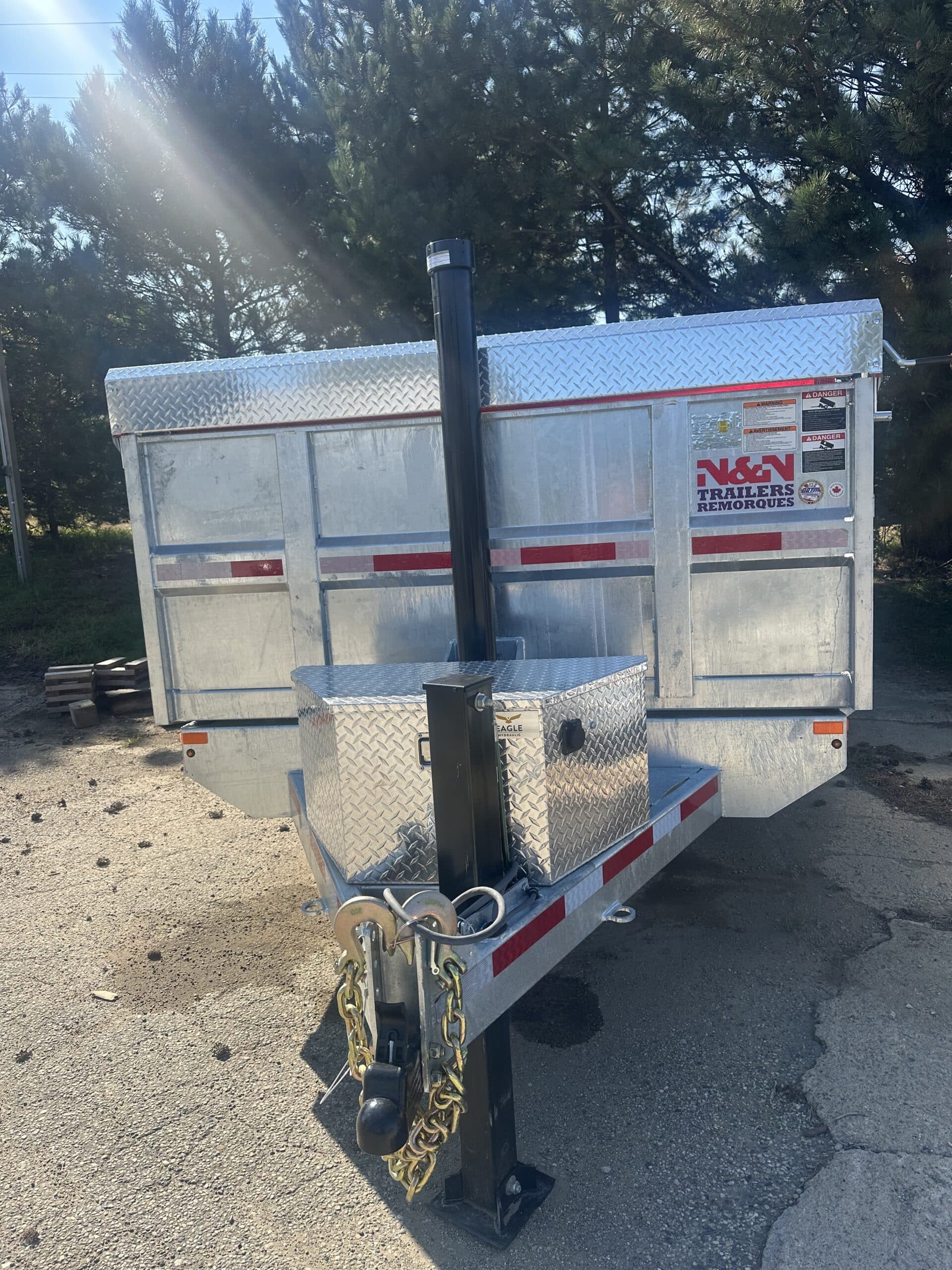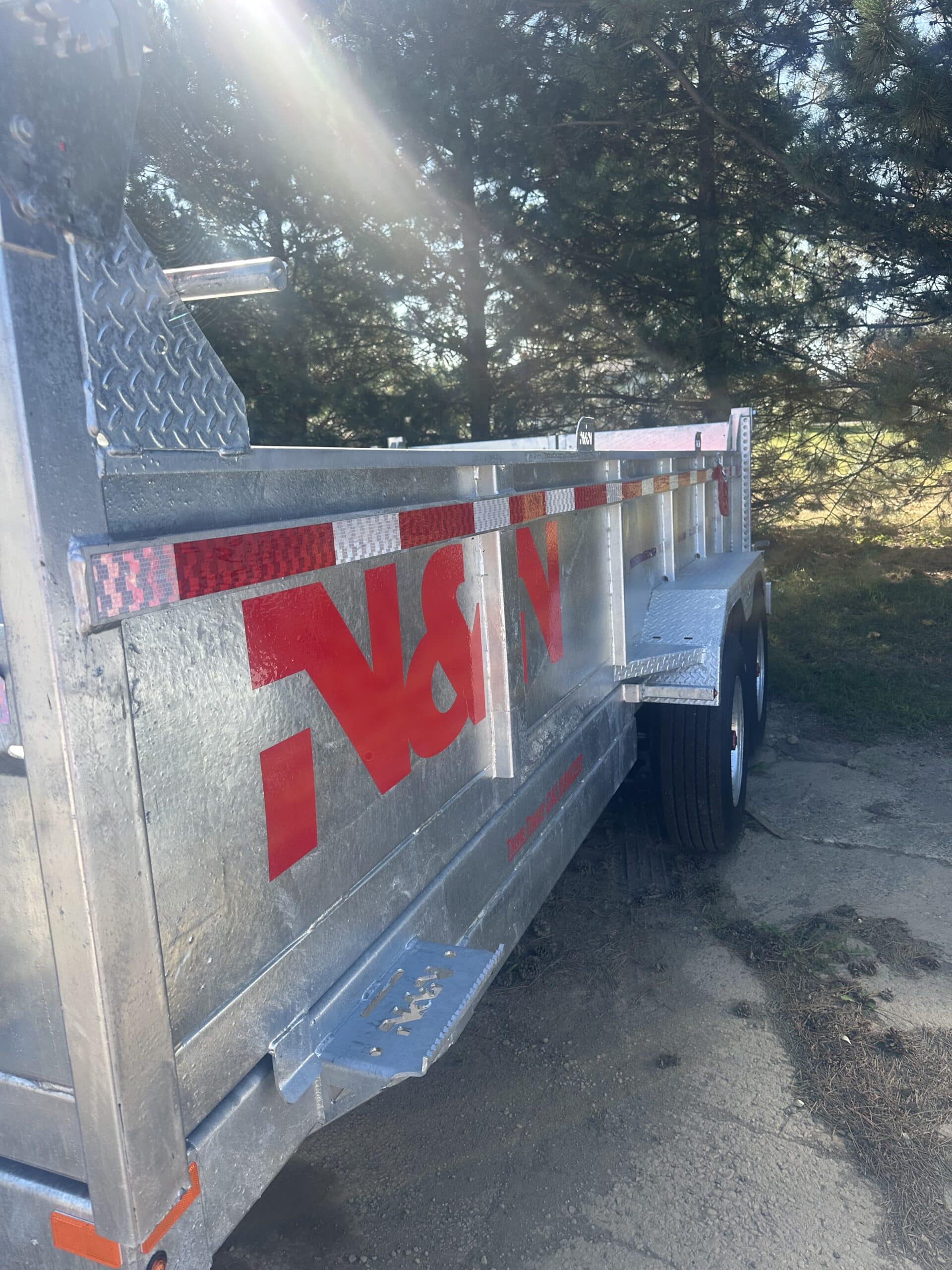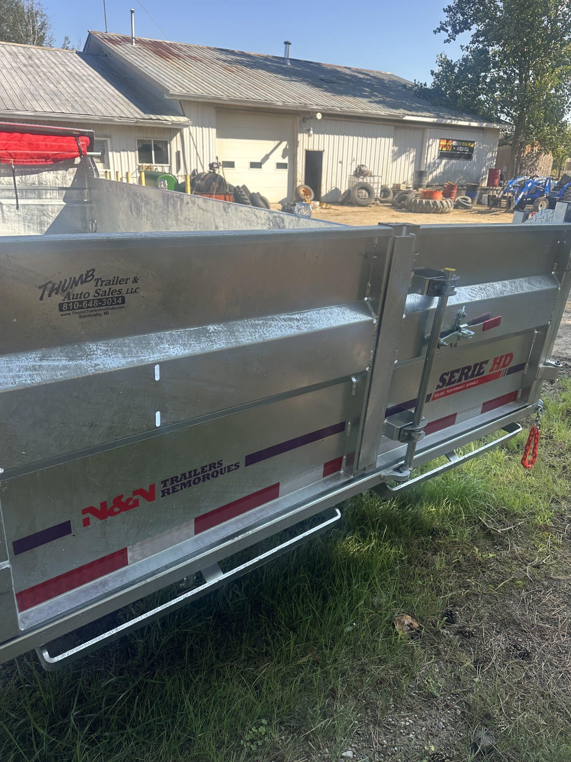 10 K axles on this monster of a trailer. All of our HD trailers come with 12 inch on center carriers and 7 guage floors. Other upgrades include tarp, ramps, rear stabilizer stands, wireless remote and backup lights. Why buy a heavy duty painted dump trailer just to watch it rust in a couple of winters? Our galvanized N&N dumps are made to last years and hold their resale value. This trailer is in stock and ready for heavy duty daily use for your business or personal needs. Give us a call and see the Thumb Trailer difference